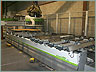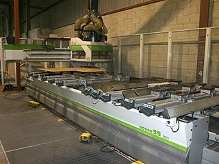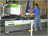 This has a working field of 60” x 144” with the possibility to drill a hole anywhere on the face of the panel. The usual drilling program is based upon the 32 mm drilling system whereby the holes on the x-axis and y-axis are measured in multiples of 32 mm. This is done to more easily facilitate the design of the horizontal elements, i.e. shelves, tops, and bottoms that should be drilled with holes spaced apart in multiples of 32 mm. There are exceptions to this but to remain in the “32 mm system” goes a long way to ensure accuracy. This machine will side drill all four sides on a panel up to 60” x 144” in size. The routers can utilize either right or left-handed tooling. There is a built-in tool crib to enable programmed machine-driven tool changeovers as different profiles come into play rather than stopping the machine to change tooling by hand. Typically a job of 0-200 pieces is most efficient for this type of machine.